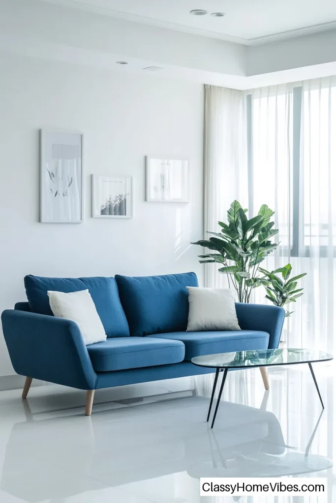 A minimalist approach with a blue couch is all about clean lines and simplicity. Keeping the decor neutral and sparse allows the couch to be the focal point. Sleek, simple furniture like a glass coffee table complements the minimalistic aesthetic without overpowering it.