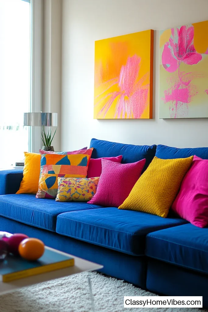 Pairing a blue couch with contrasting colors adds a dynamic and modern touch to a living room. Bright yellows, oranges, or pinks can create a striking visual contrast with blue. Incorporating pops of color through pillows, artwork, or decor pieces adds vibrancy without overwhelming the space.