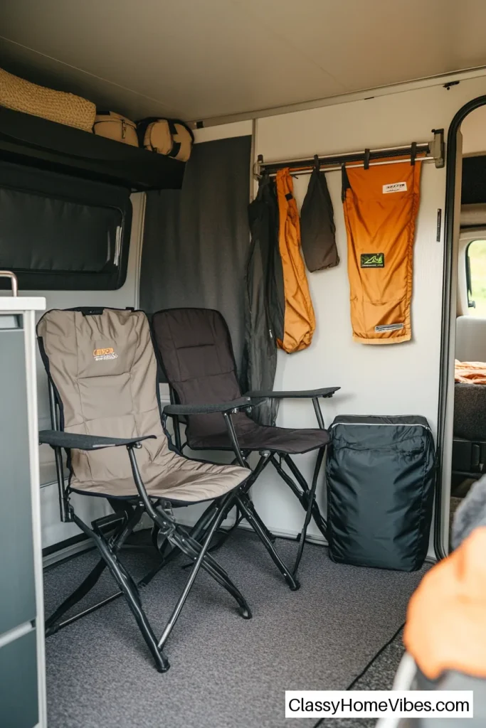 Collapsible furniture is a game-changer for those who want to save space in their camper without sacrificing functionality. Folding chairs and tables that fold flat for easy storage can be stored behind cabinets, under beds, or even hung on walls.