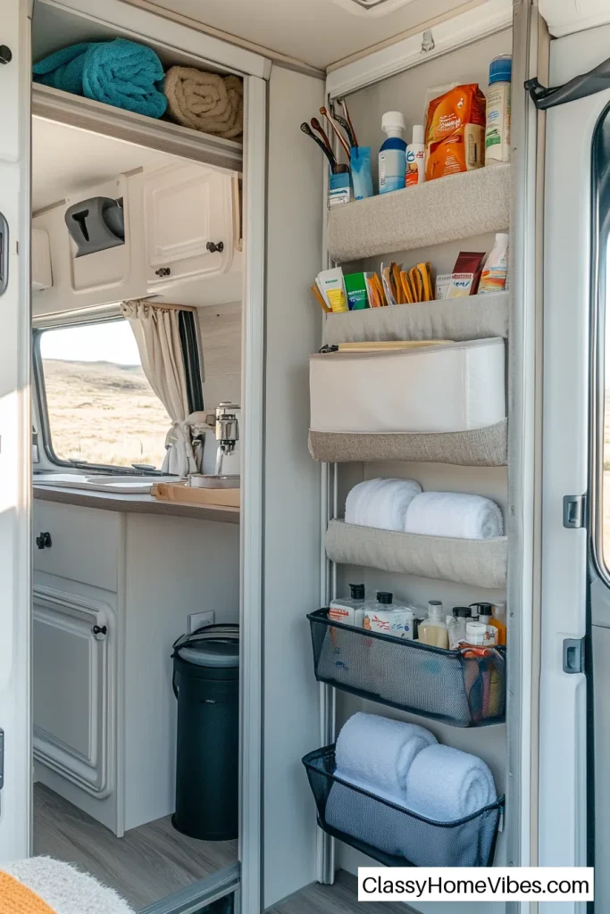 Keeping the bathroom organized in a camper is essential, and shower caddies can be your best friends. Stick-on shower caddies that attach to walls or doors are perfect for holding shampoo, conditioner, soap, and other toiletries.
