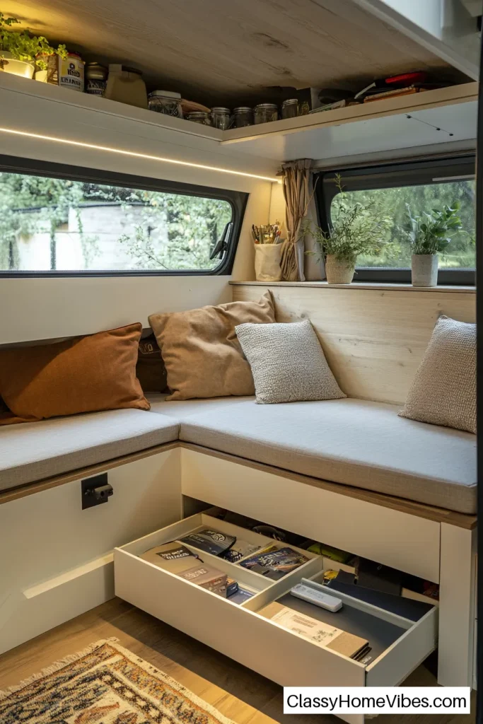 Installing drawers under seating areas can make accessing stored items more convenient than lifting an entire seat. Custom seat storage solutions are also a great DIY project to suit specific storage needs and maximize your camper’s space.