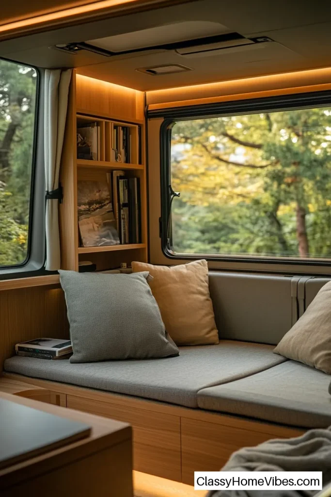 If your camper has benches or built-in seats, there’s a good chance they can double as storage space. Lift-up seat covers reveal hidden compartments underneath, ideal for bulkier items like camping gear or extra bedding.