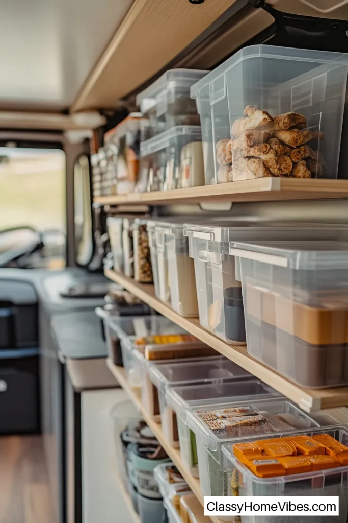 Stackable storage bins are great for maximizing vertical space in a camper. They come in all shapes and sizes, making them versatile for any setup. Choosing clear, stackable bins helps store pantry items, toiletries, or tools, allowing you to see what’s inside without needing to open each one.