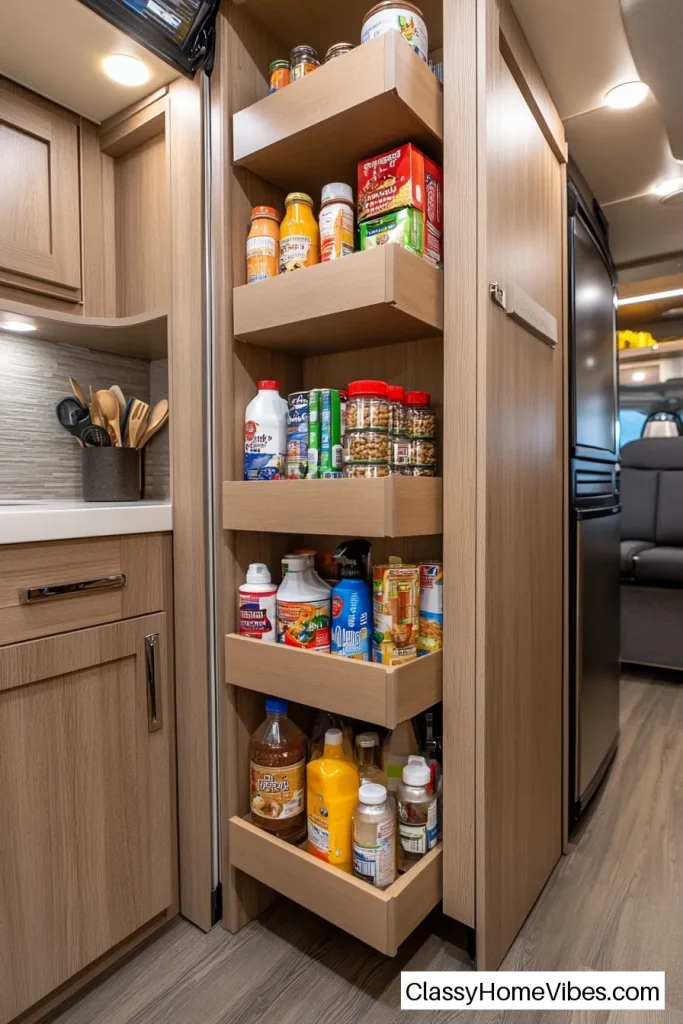 Narrow cabinets are also ideal for storing cleaning supplies vertically, keeping them accessible while saving space. Slide-out spice racks can be mounted inside narrow cabinets, maximizing storage in the camper kitchen.