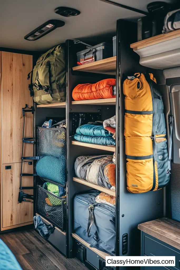 If your camper has a space above the cab, this area can become a storage haven. Adjustable shelving in the cab space can be highly versatile for storing different items, from luggage to books and extra bedding.