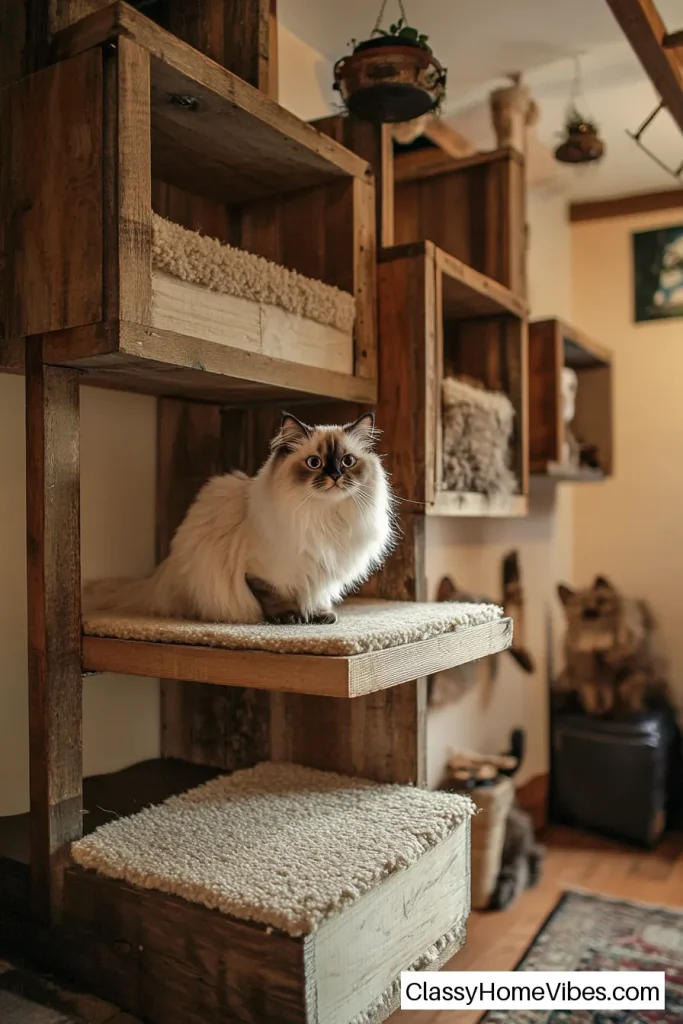 Old wooden crates can be repurposed into rustic, spacious shelves that cats will love to climb and explore. Crate shelves can be stacked and mounted in creative ways to suit your wall space, adding a unique character to your home.